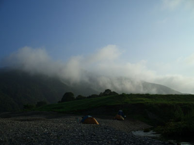 山に覆われた河原でキャンプをし、朝六時過ぎにテントから出るとなんともすがすがしい景色が広がっていた。八月も終わろうかとしている時期ではあってもまだ夏だというのに、とても朝は涼しく、山からたちのぼる霧が風に流れ、昇る太陽に透け一種独特の空間を作っていた。